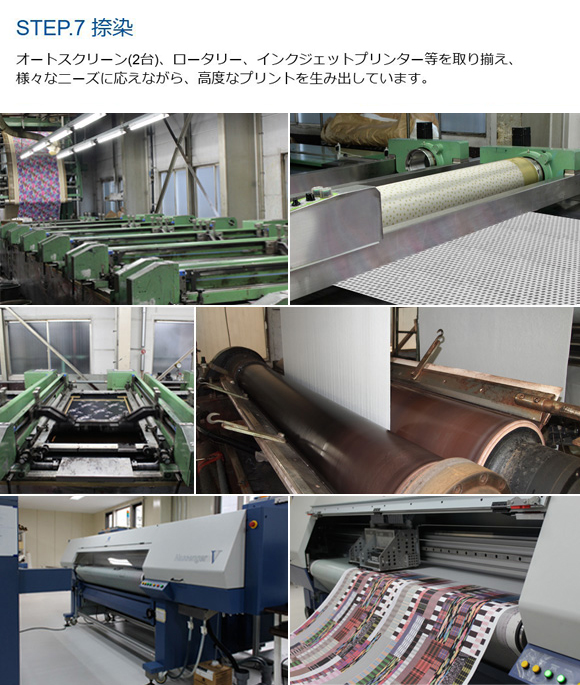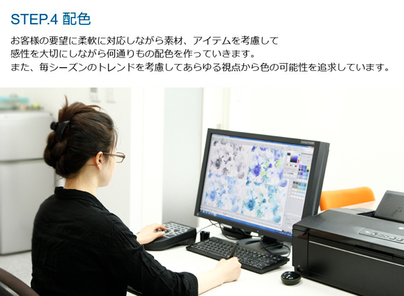 デジタルデータ化された図柄を前処理された生地にプリントしていきます。色数、柄サイズに制約がなく自由な表現ができます。